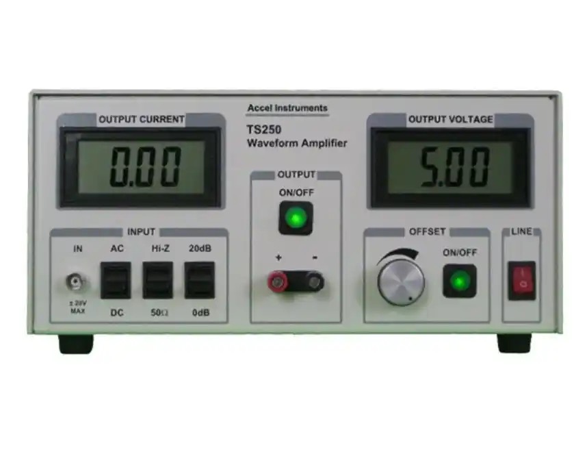 TS250波形放大器是一款独特的仪器,非常适合放大函数发生器。它放大电流或电压或功率以驱动重负载。TS250 提供 ±10V 至 +65V 八种电压范围可供选择。TS250 低压型号的输出电流高达 5A 。如应用部分所示,通过并联连接两个或多个 TS250 波形放大器可以实现更高的电流。