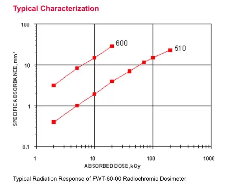 以无色衍生物形式存在的氨基三苯甲烷染料家族可实现辐射显色特性:即随着吸收剂量的变化,材料会从无色状态转变为深色状态。FWT-60系列剂量计采用六(羟乙基)氨基三苯乙腈(HHEVC)染料,可通过光度计或分光光度计进行简易分析。FWT公司专门生产用于分析其剂量计的辐射显色读数仪,常用波长为510纳米及600或605纳米,共同覆盖剂量计的全量程范围。